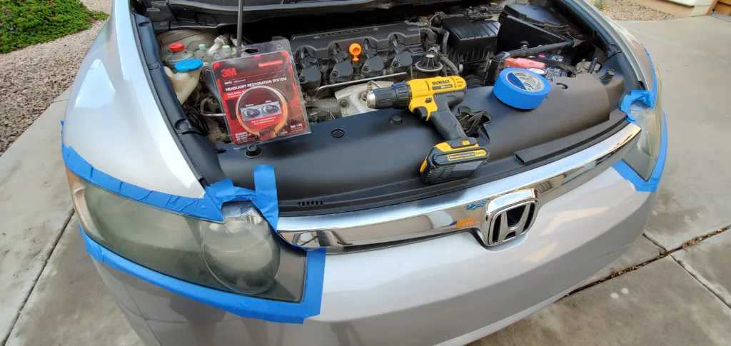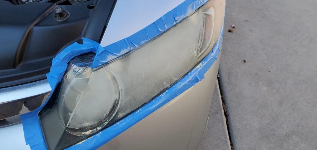 - Put painter tape around headlights to protect the sandpaper from damaging your paint. Don’t be lazy here as it will come back to bite you later with scratch marks