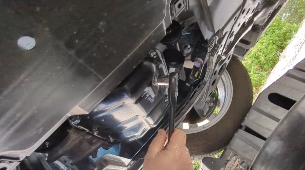 - Using a socket wrench with a 14mm socket, carefully loosen and remove the oil drain plug.