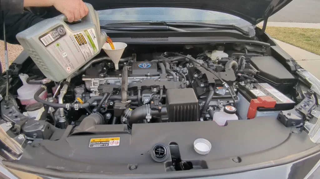 - Insert a funnel into the filler hole and slowly pour in the recommended amount of new oil. For the 2023 Hybrid Corolla it will be about 4.5 quarts of oil. Check your vehicle’s manual for the correct oil quantity.