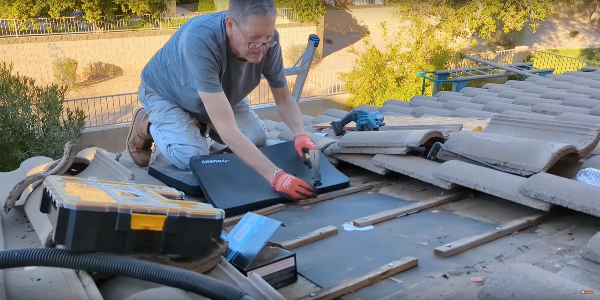 Really important is to use proper safety equipment like wear appropriate safety gear, including non-slip shoes or shoes with good traction. Eye protection is a great idea when cutting battens or other parts of the roof with a power tool. Also, a safety harness is a good idea, some homes have D ring loops along the roof line to tie into to ensure you don’t fall off the roof. These anchor points can prevent falls especially on steep or slippery roofs. For us the roof pitch was mild, the traction was good, and the weather was nice which made it easier for us than some others may encounter.