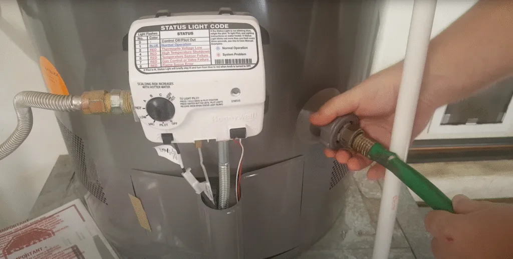 - Open Drain Valve: Open the drain valve to allow water to flow out through the hose. Be cautious as the water may be hot. You can open the pressure relief valve at the top of the heater to speed up the draining process.