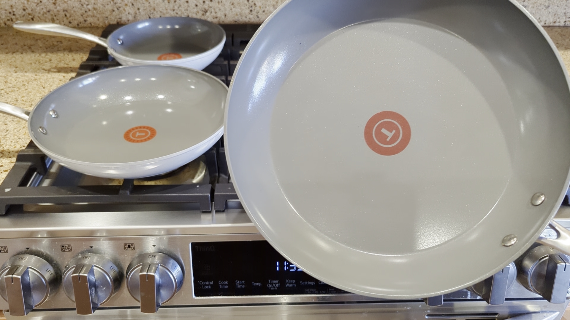 According to T-fal, this ceramic non-stick 3-piece frypan was made to meet the demands of a creative and inspiring kitchen, featuring a seamless edge-to-edge ceramic non-stick coating with timeless stainless-steel handles for modern taste. They claim you will “experience an ultra-smooth gliding surface for effortless cooking and clean-up with Inoceram Glide Technology, our best-in-class ceramic non-stick coating”.